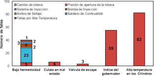 La mayor falla detectada en el año 2015 (Figura 5a) fue por alta temperatura (82 fallas), la cual está directamente relacionada con el índice del gobernador (55 fallas). El «gobernador» es el encargado de dar el ángulo de apertura de la cremallera, en otras palabras, el acelerador. Cuando el índice es alto indica un aumento en la aceleración del motor, por lo que en un período prolongado de trabajo provoca altas temperaturas y presión en los cilindros [20–22]. Un alto valor de índice de gobernador, y en conjunto con un inadecuado funcionamiento del inyector, puede provocar altas temperaturas en los cilindros, porque permite el control del índice de cremalleras y la entrada del combustible [23]. Al trabajar los inyectores de forma ineficiente, se incrementa la entrada de combustible al interior del cilindro, y se eleva la temperatura por el exceso de combustible en la cámara de combustión [2]. Este fenómeno provoca también la generación de gases residuales de color negro [24].