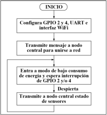 La programación del microcontrolador de los nodos de monitorización realiza las siguientes actividades: 1) Configura las terminales GPIO 2 y GPIO 4 como entradas, inicializa el UART1 y configura la interfaz inalámbrica, 2) Transmite el mensaje al nodo central para unirse a la red y 3) Activa el modo de reposo o bajo consumo de energía del cual sale al recibir la interrupción de las terminales GPIO 2 o GPIO 4. Al despertar el microcontrolador y salir de este modo, transmite el mensaje al nodo central indicando el valor de la salida o estado de los sensores y retorna al modo de reposo. En la Figura 3 se indica el diagrama de flujo usado para realizar este programa.