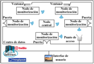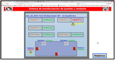 El presente trabajo es resultado del requerimiento de una empresa propietaria de centros de datos. Se solicitó realizar un sistema cuyo objetivo sea transmitir a un servidor ubicado en la nube el cambio de estado, abierta o cerrada, de tres puertas y dos ventanas de la sala de equipos del centro de datos. Los cambios de estado, así como fecha y hora deben ser almacenados por el servidor. El sistema debe contar con una interfaz de usuario, que se pueda acceder desde la Internet, mediante la cual se muestre en línea el estado de puertas y ventanas e históricamente puedan verse los cambios de estado. En caso de que una puerta o ventana permanezca abierta más de un período de tiempo configurable, se deberá enviar un mensaje de alerta SMS y de WhatsApp al teléfono móvil del administrador del sistema. En el centro de datos se encuentra instalado un punto de acceso wifi a la Internet localizado a 35 metros de la ventana más lejana.