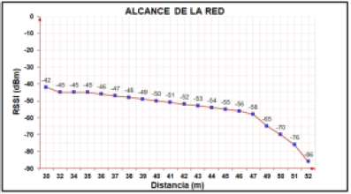 Aunque no se presentaron problemas en la comunicación de los nodos de la red con el punto de acceso wifi 802.11 n, se realizó el segundo grupo de pruebas para determinar el alcance de la red. Para llevar a cabo estas pruebas se ubicó un nodo de monitorización en distintos puntos del centro de datos, inclusive en lugares más distantes a la ventana más lejana al punto de acceso. Los resultados mostraron que el alcance de la red es 47 metros con línea de vista a una velocidad de 230 Mbps, menor a los 300 Mbps que pueden lograrse teóricamente usando el estándar 802.11 n. A una distancia mayor a 47 metros la potencia de la señal wifi recibida (RSSI-Received Signal Strength Indicator) en el nodo de monitorización, decreció aceleradamente y se perdió el enlace cuando el nivel cayó a los -86 dBm como se muestra en la gráfica de la Figura 5.