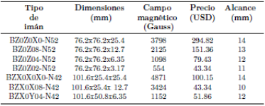 Por otra parte, en el mercado existe una gran cantidad de tipos y proveedores de imanes. El proveedor con mayor variedad de imanes es K&J Magnetics. Cuenta con imanes de Neomidio de grado N35, N38, N40, N42, N45, N48, N50 y N52, de distintas dimensiones, formas y alcance de campo magnético. El grado indica nivel de intensidad o fuerza del campo magnético del imán, N35 es el nivel más bajo. En la página web de K&J Magnetics se encuentra disponible una calculadora que permite determinar el imán adecuado dependiendo de las características necesarias. Para la realización de este trabajo se utilizaron imanes BZX0X08-N42 cuyas características son las siguientes: longitud 101.6 mm, ancho 25.4 mm, grosor 12.7 mm, intensidad de campo magnético 3,424 Gauss y alcance de campo magnético 10 mm. El alcance de campo magnético determina la distancia máxima bajo la cual se mantiene la intensidad del campo magnético antes de disminuir.