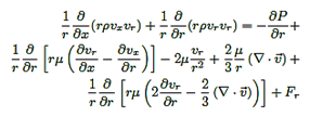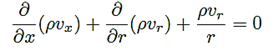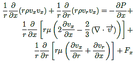 Donde, los parámetros son: la densidad p, la velocidad axial vx y velocidad radial vr, el radio r, la viscosidad μ, los gradientes de presión