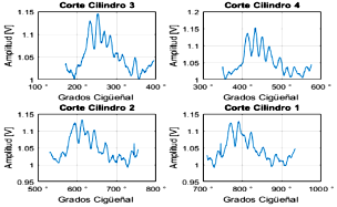 Se realiza un corte completo en la señal del sensor MAP que corresponde a un ciclo del motor (720°±180°), tomando en cuenta el reglaje de distribución de adelanto a la apertura de admisión (AAA) y retraso de cierre de admisión (RCA), correspondiente a cada uno de los cilindros [11]. Se desarrolla un ventaneo de la señal del sensor tipo MAP para cada cilindro, la cual se observa en la Figura 5.