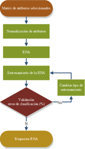 El algoritmo inicia con la lectura de la matriz de entrada y respuesta respectiva para la RNA. Luego se normaliza el vector de entrada y la respuesta con el valor máximo de cada matriz con el objetivo de optimizar la creación de la RNA. Una vez normalizada la matriz de atributos se procedió a la creación de la RNA [11].