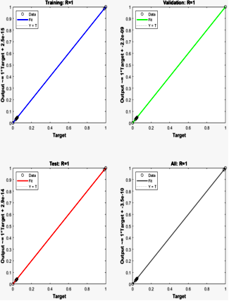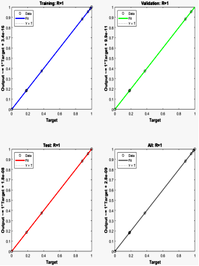 Las líneas indican los valores esperados y los círculos negros representan los valores pronosticados por la RNA. La predicción determinada por la red neuronal es eficiente y se corrobora con un buen desempeño, dado que se obtiene un índice global de 1 en entrenamiento, validación y prueba lo que indica una relación lineal fuerte positiva entre las condiciones reales del MEP y los resultados proporcionados por la red neuronal [11].