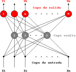 La arquitectura de la red se muestra en la Figura 9, donde el subíndice p indica el p-ésimo vector de entrenamiento, j el número de neurona oculta y el índice i varía desde 1 hasta el número de entradas de la capa de entrada.