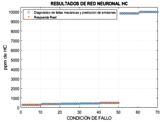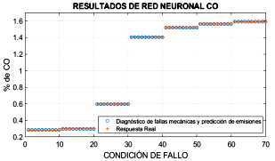Obtenidos los resultados de las condiciones funcionales del motor de encendido provocado, se puede resaltar que la diferencia entre las respuestas tanto de condición real y respuesta de red neuronal de CO y HC tienen un valor próximo a cero. Por lo tanto, la aplicación del sistema de diagnóstico de fallas mecánicas y predicción de emisiones contaminantes es capaz de detectar la condición funcional de falla mecánica y predicción de emisión contaminante.