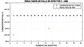 En la Figura 14 se muestran los resultados de los valores obtenidos por la red neuronal CO para los estados de funcionamiento cuando el inyector 2 se encuentra con falla.