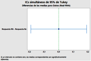 En efecto en la Figura 16 se observa que al agrupar los datos de condición real del motor y respuesta obtenida de la RNA de CO y en la Figura 17 la del HC, mediante el método estadístico de Tukey con un índice de confianza del 95 %, se determina que las medias son equivalentes y no existe una diferencia estadísticamente significativa, ya que las medias de cada una de las respuestas coinciden en un valor próximo a cero.