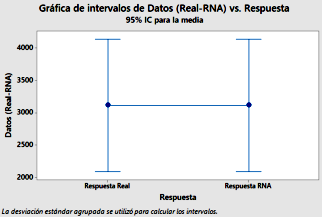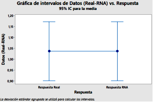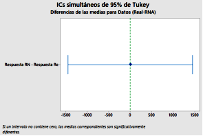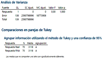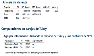 Asi mismo, en las Figuras 20 y 21 se corrobora que existe una relación entre la respuesta real y de la red neuronal ya que comparten la misma letra de agrupación (A) y el valor p (p-valúe) es igual a 1. Dando como resultado un valor de confiabilidad aproximadamente del 100,00 %, siendo este valor aceptable para temas de diagnóstico de fallas mecánicas y predicción de emisiones contaminantes de motores de combustión interna de encendido provocado.
