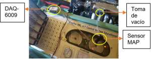 Se realiza la instalación del sensor de presión de admisión ubicándolo en el colector de admisión del MEP, consecuentemente se adquiere muestras de emisiones de NOx, CO, CO2 y HC mediante el analizador de gases, la señal del sensor MAP con una tarjeta Ni DAQ-6009 en conjunto con el software LabVIEW se registra las muestras MAP.