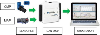 La identificación respectiva de cada cilindro del motor se realiza mediante el registro de la señal del sensor de posición del árbol de levas (CMP). En la Figura 1, se presenta la unidad experimental puesta a prueba Motor Hyundai Sonata 2.0 DOHC, un analizador de gases, una computadora personal (PC) y un escáner automotor. En la Figura 2, se muestra la conexión del sensor tipo MAP, la toma de vacío en el colector de admisión y la herramienta de adquisición de datos Ni DAQ-6009.