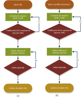 Para obtener los datos de las señales de los sensores MAP y CMP se aplica el proceso representado en el flujograma de la Figura 4. El proceso de obtención de datos se inicia con la revisión del motor en correcto funcionamiento o falla supervisada, posterior a ello se procede a inspeccionar la conexión de los sensores. Si la conexión es correcta, se graba la señal con el software Labview y se registra en un archivo de Excel, de lo contrario, se procede a verificar la conexión de los sensores [11]. Para registrar las señales se aplica el procedimiento antes descrito tanto para el caso de motor en buen funcionamiento como para el motor con falla supervisada, Figura 4 (a); 4 (b) [11]. El proceso de adquisición de datos se realiza 20 veces para cada una de las condiciones del motor.