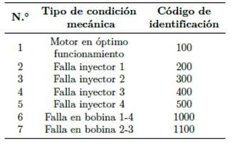 En la Tabla 3 se indica el total de seis fallas que se generan en la unidad experimental MEP, cada una con su respectivo código de identificación; también se indica la condición del motor en óptimo funcionamiento.