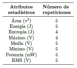 Para seleccionar los atributos que serán considerados en la entrada de la red neuronal se realizó un análisis de coincidencia de la matriz general de la cual se seleccionaron los atributos que más se repiten entre los resultados de cada método estadístico aplicado [11]. Los atributos que más se repiten se muestran en la Tabla 4.