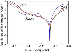 Asimismo, Yao et al. [10] evaluaron el comportamiento a la corrosión comparativamente de tres tipos de recubrimientos de zinc con diferentes combinaciones de Zn, Al, Mg y Cu (Zn-0,1 Cu (G), Zn-5Al-0,1Cu (ZA) y Zn-5Al-1Mg-0,1Cu (ZAM)). Realizaron pruebas de cámara de niebla salina y electroquímicos en una solución acuosa de 5 y 3,5 % de NaCl, respectivamente, para acceder al comportamiento de corrosión de los recubrimientos.