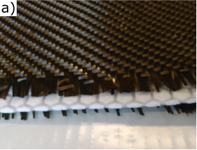 Usualmente, las láminas superficiales son chapas compuestas con varias capas con tejidos orientados en diferentes direcciones, para mejorar el comportamiento de la isotropía [21]. Frecuentemente, estas láminas superficiales consisten de chapas de poliéster no saturado (UP, unsaturated polyester) con fibras de vidrio (GF, glass fibers) para aplicaciones con desempeño mecánico moderado, o capas epoxi (EP, epoxy) con fibras de carbono (CF, carbon fibers) y/o aramida (AF, aramid fibers) para aplicaciones con alta exigencia mecánica [22, 23]. Usualmente, el núcleo está hecho de materiales con baja densidad y características mecánicas relativamente pobres, debido a que su propósito no es soportar resistencia mecánica. Los materiales del núcleo ofrecen alta ligereza y muy buena capacidad de absorción de los esfuerzos de corte. Algunos de los núcleos ampliamente utilizados incluyen madera de balsa, poliuretano, o estructuras de panal [24–26]. La fabricación de paneles tipo sándwich compuestos, se lleva a cabo usualmente mediante laminado manual y envasado al vacío.