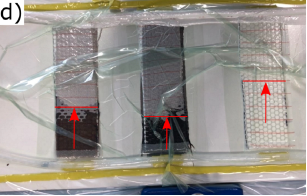 Se fabricaron diferentes secuencias de apilamiento, como puede verse en la Tabla 1. El procedimiento fue el siguiente. Primero, una superficie plana fue limpiada con antelación, y luego cubierta con una capa fina de un agente de liberación poli(alcohol vinílico)-PVA. Segundo, una lámina pelable fue colocada sobre la fina capa de PVA, para hacer más accesible el proceso de desmoldado. Luego los tejidos y el núcleo fueron apilados como se indica en la Tabla 1 y en la Figura 1(a). A partir de este paso, el proceso es ligeramente diferente al de una infusión convencional de resina (VARIM). Como puede verse en la Figura 1(b), la malla de purga en vez de cubrir todo el apilamiento, solo se coloca en el lado donde estará ubicada la entrada de resina, la cual es responsable de asegurar el flujo de resina desde la entrada al núcleo. Mientras tanto, el tubo de distribución de resina fue colocado sobre la malla, y el tubo de vacío fue cubierto con una lámina de fieltro que permitía el vacío, pero restringía el flujo de resina. Finalmente, todos los elementos fueron sellados con una bolsa plástica y una cinta de embalar de doble cara (Figura 1(c)). Para asegurar que no hubiese fuga de resina, el vacío fue probado previamente. Luego, se permitió a la resina fluir hasta que todas las láminas estuvieran completamente empapadas. Luego de esto, se cortó el suministro de resina, pero el vacío se mantuvo por 8 horas hasta que la resina estuviera completamente curada a temperatura ambiente. Con estas condiciones de curado, no es necesario ningún proceso adicional posterior a la cura. Como puede verse en la Figura 1(d), el núcleo ayuda a la resina a fluir a través del panel tipo sándwich. Las fibras de lino fueron las que mejor absorbieron la resina, debido a su estructura porosa, seguidas por las fibras de basalto. El Soric® Lantor ayuda a que la resina sea propagada de manera homogénea a través de las láminas superficiales, lo cual conduce a que el panel compuesto se moje completamente.