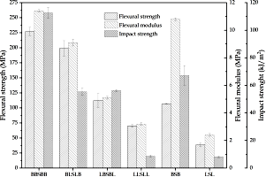 El análisis de materiales tales como BLSLB y LBSBL, que tienen el mismo número de capas de fibras de basalto y lino en las láminas superficiales (una capa de basalto y una capa de lino en cada lámina superficial), pero con diferente configuración de apilamiento, da resultados impresionantes. El panel con las capas de basalto en el lado externo de las láminas superficiales ofrece valores más altos de resistencia a la flexión y módulo de flexión, que son solo 12 % y 19 % menor, respectivamente, en comparación con el material con cuatro capas de basalto. La secuencia de apilamiento BLSLB conduce a propiedades mecánicas interesantes de 199±12.7 MPa y 9.14±0.25 GPa para la resistencia a la flexión y el módulo de flexión, respectivamente.