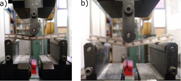 Como era de esperarse, los paneles compuestos completamente por fibras de lino son los que tienen peores propiedades a flexión. La Figura 3 muestra un ejemplo del tipo de falla que sufrieron los paneles. La Figura 3(a) muestra el material BSB que está compuesto únicamente de una capa de basalto en cada una de las superficies; como se mencionó anteriormente, el núcleo utilizado no proporciona ninguna resistencia extra al material final. Puede observarse que la falla del material es causada por el núcleo y no por las fibras de refuerzo. Por otra parte, la Figura 3(b) indica que la falla del material LSL se debe a la baja resistencia de las fibras de lino en la lámina superficial inferior, que está trabajando en condiciones de tracción.