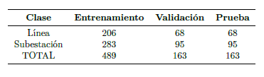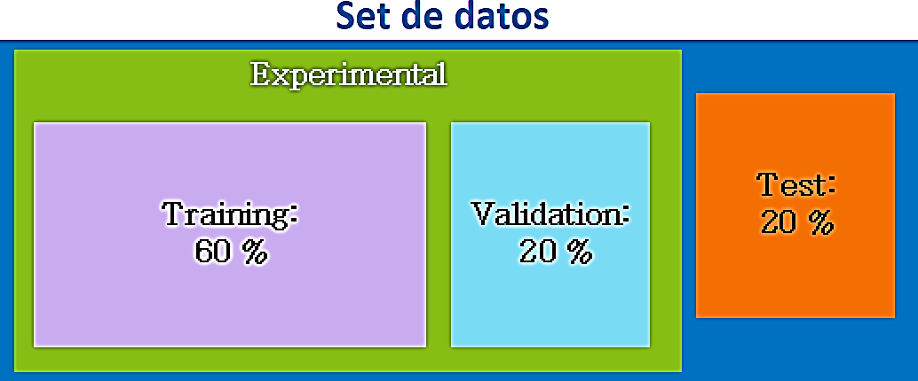 Para la realización de los experimentos se utilizaron 815 imágenes térmicas, divididas en tres conjuntos de datos con una división 60-20-20, conocido como una separación tipo hold-out (ver Figura 2). El 60 % de las imágenes se consideraron como datos de entrenamiento y el 20 % de validación, mientras que el 20 % restante, se incluye en los datos de prueba del modelo (ver Tabla 2), es decir, que este es entrenado y validado paralelamente para finalmente ser probado con imágenes nuevas que no han sido consideradas con anterioridad. En [39] se indica que los modelos que generalizan adecuadamente muestran métricas de exactitud y pérdida similares en el entrenamiento y validación, evitándose el sobreajuste.