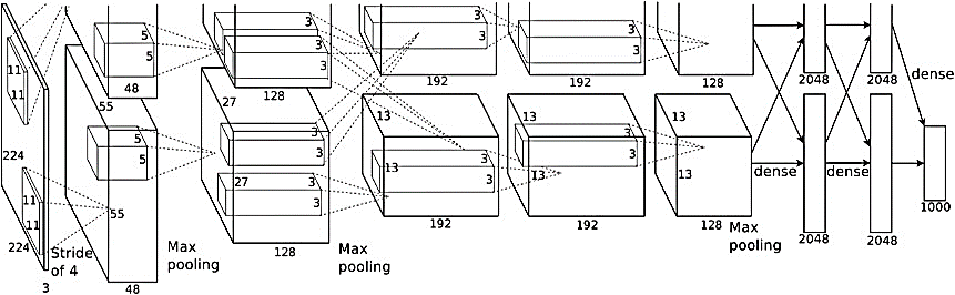 Red neuronal convolucional compuesta por ocho capas [41], cinco de las cuales son max-pooling, y las tres restantes, fully connected. Esta arquitectura fue entrenada con la función de activación ReLU (Rectified Linear Units) y la base de datos ImageNet. Como se observa en la Figura 9, la entrada de la red son las imágenes de 224 × 224 píxeles, las cuales se van transformando en cada una de las capas, hasta obtener como salida, la clasificación de mil categorías.