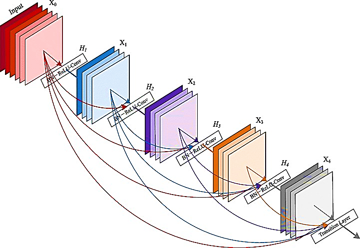 CNN en la que cada capa obtiene entradas adicionales de todas las capas anteriores y pasa sus propios mapas de características a todas las capas posteriores [45], es decir, que se concatenan cada una de las salidas de las capas anteriores con las posteriores, buscando contar con menor cantidad de parámetros y una mayor exactitud que redes como ResNet. La arquitectura de DenseNet se aprecia en la Figura 13.