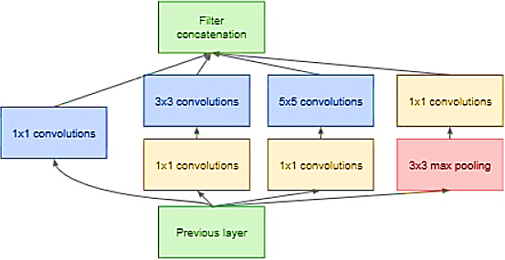 Red neuronal desarrollada por Google con la finalidad de realizar clasificaciones de imágenes [46]. Esta CNN está basada en la arquitectura Inception [47], por lo que usa módulos que dan la posibilidad de elegir entre distintos tamaños de filtro convolucional en cada uno de los bloques. Un ejemplo del módulo inception se aprecia en la Figura 14.