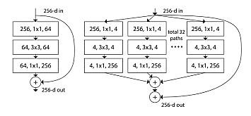 Es una variante de ResNet que busca aumentar el número de caminos o rutas paralelas a la conexión residual [50], es decir, que ResNeXt es una CNN con múltiples ramas, tal como se observa en la Figura 16, la cual muestra un bloque con una cardinalidad de 32.
