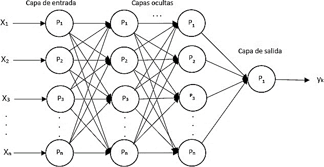 machine learning (ML) o aprendizaje automático, es una rama de la IA que busca generalizar comportamientos de un conjunto de datos de entrada, es decir, que su objetivo es predecir comportamientos futuros basados en encontrar patrones dentro de grandes con- juntos de datos [5]. A su vez, el DL o aprendizaje profundo, forma parte del machine learning [6], cuyo objetivo es que los sistemas imiten el comportamiento y el razonamiento de las personas automáticamente; en otras palabras, que el ser humano esté involucrado lo menos posible en el proceso. Este objetivo se basa en el uso de redes neuronales artificiales (ANN), las cuales simulan la sinapsis del cerebro humano [7]. En la Figura1 se puede apreciar la estructura tradicional de una red neuronal artificial, en la que se incluyen la capa de entrada, capas ocultas y la capa de salida.