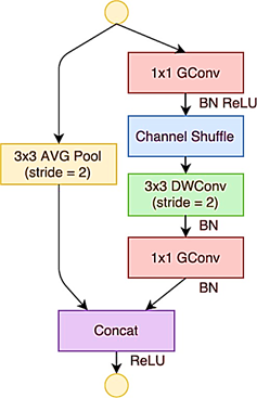 Es una CNN que presenta como componente principal una nueva operación de reorganización de canales [53], buscando que la información fluya con mayor facilidad en los mismos. En la Figura 19 se observa una unidad ShuffleNet, que es un elemento central dentro de esta arquitectura.