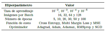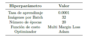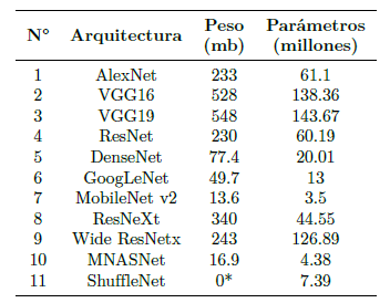 Finalmente, se elaboró la Tabla 3 mediante información proporcionada en el sitio web de TorchVision [54]; en ella se resumen las características de estas arquitecturas en relación con el peso en megabytes y número de parámetros que utilizan para el entrenamiento del modelo, resaltando que ShuffleNet es la única arquitectura que actualmente no permite el uso del parámetro de configuración de preentrenamiento, es decir, que su peso es cero megabytes.