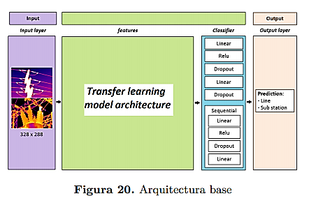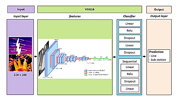 En esta arquitectura se aprecia que la entrada está representada por las imágenes de 328 × 288 píxeles, las cuales ingresan a la red neuronal convolucional previamente entrenada VGG16, compuesta por trece capas convoluciones seguidas por tres capas totalmente conectadas, las dos primeras presentan 4096 canales y la última 1000, por lo que esta fue editada para poder realizar una clasificación binaria (2 canales). Las capas ocultas utilizan la función de activación ReLU además de diversos kernels 3 × 3. Finalmente, se obtiene como salida la clasificación entre ambas clases, es decir, líneas y subestaciones.