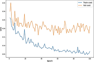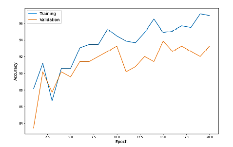 Debido a que no se encontró investigaciones que comparen este número de arquitecturas aplicadas a la termografía, y con la finalidad de realizar una comparación justa entre los modelos, se consideraron los mismos hiperparámetros en todas las pruebas realizadas. La elección de estos fue tomada sobre la base de experimentos empíricos, tal como se propone en [55,56, 57], teniendo como base los valores de la Tabla4. Los resultados de los experimentos iniciales arrojaron que existe un punto de quiebre aproximadamente en la época número 20, en donde las curvas de entrenamiento y validación presentan una tendencia de separación, evidenciándose problemas de overfitting o sobreentrenamiento (ver Figura 21). Se concluye que los modelos obtienen mejores resultados según los hiperparámetros detallados en la Tabla 5 y es con estos datos con los que se ejecutaron las demás pruebas.