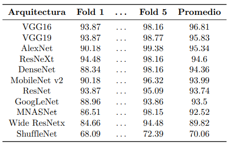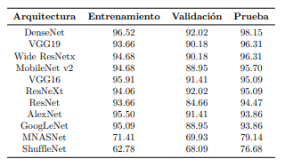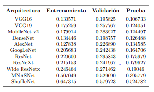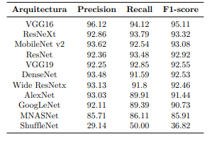 Se realizó el entrenamiento de las once arquitecturas tomando los valores de la Tabla 5, obteniendo resultados de exactitud de cada uno de ellos, los cuales se muestran en la Tabla 6. Por otro lado, en la Tabla 7 se observan las tasas de pérdida de cada una de las arquitecturas. En función de estos resultados se aprecia que DenseNet obtiene un mayor grado de exactitud, mientras que VGG16 presenta una tasa de pérdida más baja. Un dato adicional a considerar es que ShuffleNet alcanza los peores resultados debido a que fue la única arquitectura sin entrenamiento previo, evidenciando que las arquitecturas previamente entrenadas, obtienen mejores resultados.