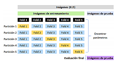 El mecanismo de separación tipo hold-out puede no ser suficiente al comparar distintos modelos, es por ello por lo que con la finalidad de eliminar esta fuente de variabilidad se realizaron otros experimentos mediante validación cruzada con 5-folds (ver Figura 23) tal como se sugiere en [61], seguida de una comparación estadística de los resultados de cada modelo, de la misma forma como se realiza en [12]. Los resultados de la validación cruzada se pueden apreciar en la Tabla 9.