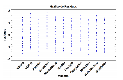 Debido a que las poblaciones no se aproximan a una distribución normal, no se puede aplicar una prueba paramétrica; es por ello por lo que se hace necesario utilizar una prueba no paramétrica, específicamente el Test de Friedman en el que no se requiere cumplir la condición de normalidad o de homoestacidad (igualdad de varianzas). Mediante este análisis plasmado en la Tabla 10, se obtiene que el p-value es igual a cero, es decir, que existe diferencia entre las poblaciones, mostrando que VGG16 es superior a las demás arquitecturas.