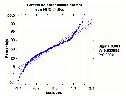 En relación con las pruebas estadísticas para evaluar el rendimiento de las arquitecturas, en primer lugar, se ejecutó 30 veces cada modelo, tal como se llevó a cabo en [12]. Posteriormente se realizó el análisis de residuos y de probabilidad normal evidenciándose que, según el primero, se podría aplicar una prueba paramétrica ya que los residuos presentan una dispersión similar (ver Figura 24). Sin embargo, al analizar el gráfico de probabilidad normal para verificar que los residuos se aproximen a una distribución normal, se aprecia que existen datos que se encuentran fuera del intervalo de confianza, con el coeficiente de Shapiro–Wilk igual a 0.932994 y un p-value igual a 0 (ver Figura 25). De igual manera, se realizó la transformación de los datos mediante la raíz cuadrada, sin embargo, estos siguen encontrándose fuera del intervalo de confianza.