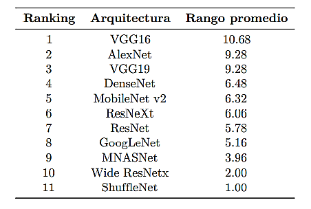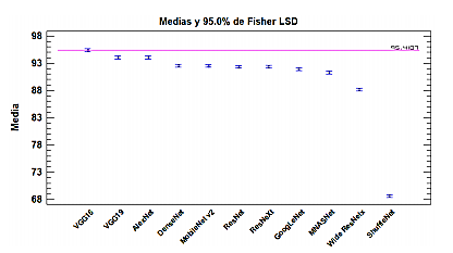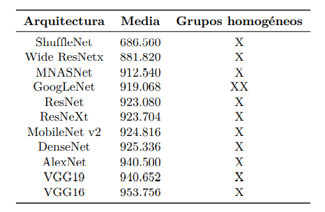 Adicionalmente, se realizó el análisis de comparaciones múltiples mediante la prueba con múltiples rangos (ver Tabla 11), en donde si las «X» de los grupos homogéneos se encuentran en la misma columna las arquitecturas se comportan de manera similar, apreciándose que VGG16 es superior y diferente a las demás arquitecturas.