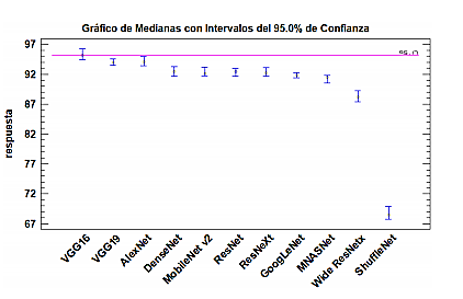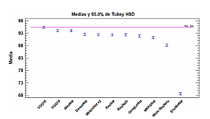 Este mismo resultado se evidencia en el análisis de medias, en el que se aprecia que el intervalo de confianza que se ha construido tanto con el método Fisher LSD (Figura 26) como Tukey HSD (Figura 27), es superior en el caso de VGG16 ya que no se interseca con el de las otras arquitecturas. En el caso del análisis de medianas se observa que la arquitectura VGG16 es superior a la gran mayoría, pero presenta una pequeña intersección con las arquitecturas AlexNet y VGG19 (ver Figura 28).
