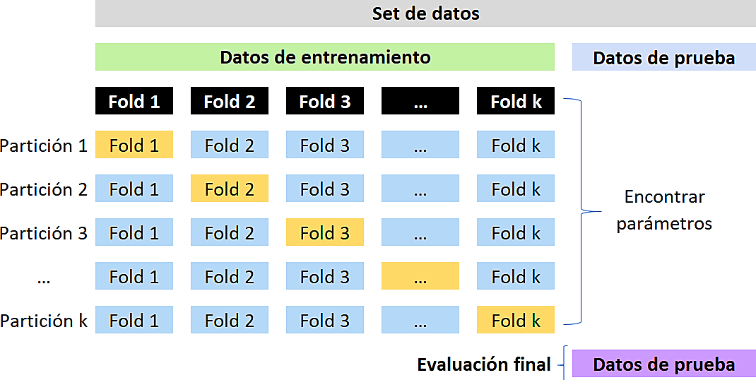 En relación con la separación del set de datos, la técnica tipo hold-out[10] es una de las más utilizadas, y consiste en realizar una división de los datos en tres subconjuntos: el 60 % destinado a entrenamiento, el 20 % a validación y el 20 % restante a las pruebas del modelo, tal como se observa en la Figura 2. Sin embargo, este tipo de técnicas no puede considerarse suficiente para evaluar el rendimiento de los modelos, por lo que la bibliografía sugiere aplicar una validación cruzada con k-folds[11] a través de la división del set de datos aleatoriamente en k subconjuntos, de los cuales k - 1 se utilizan para entrenar el modelo, y uno para validarlo. Este mecanismo se debe repetir k veces en cada iteración, empleando distintos subconjuntos de validación, tal como se aprecia en la Figura 3. Finalmente, se recomienda realizar una comparación estadística de los resultados de cada modelo [12], en donde entran a tallar técnicas paramétricas como el análisis ANOVA, o no paramétricas como el test de Friedman [13].