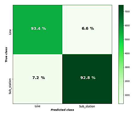 Con este modelo se obtuvieron precisiones de 95.91 % y 91.41 % en el entrenamiento y validación (Figura 30). Esta arquitectura fue probada con nuevas imágenes pertenecientes al conjunto de datos de prueba, el resultado obtenido fue 94.43 % de exactitud para la categoría Líneas, y 92.81 % para las subestaciones. Esta se puede apreciar en la matriz de confusión plasmada en la Figura 31.