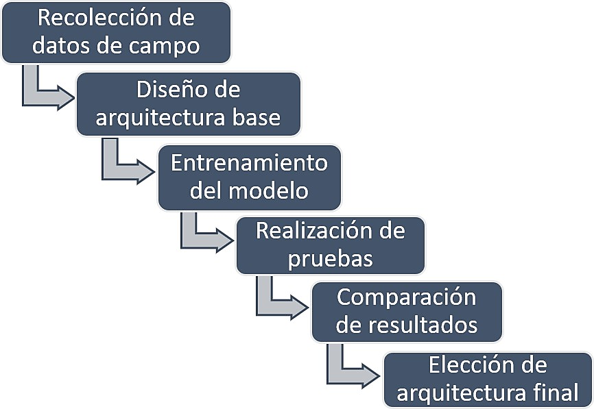 La Figura 5 representa la metodología seguida en la realización de la investigación, la cual parte de la recolección de datos de campo mediante la captura de imágenes térmicas; posteriormente se realiza el diseño de una arquitectura base en la que se incluyen distintas arquitecturas de transfer learning entrenadas previa- mente, cada una de ellas es entrenada y probada para finalmente comparar los resultados obtenidos. Todo este proceso se realizó con la ayuda del servicio en línea Google Colaboratory, a través del uso de Jupyter Notebooks [35].