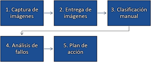El procedimiento que la empresa de distribución eléctrica ha venido ejecutando incluye cinco fases que se detallan a continuación y se grafican en la Figura 6. (i) En primer lugar, se contrata a una empresa externa para la captura de imágenes térmicas, específicamente líneas de transmisión y subestaciones eléctricas, esto se realiza de forma semanal o mensual. (ii) La empresa de servicios entrega todas las imágenes a un especialista certificado en análisis de imágenes térmicas. (iii) El especialista debe clasificar manualmente las imágenes y dividirlas entre líneas de transmisión o equipos de subestaciones eléctricas, ya que requieren diferentes tipos de análisis. (iv) Luego el especialista procede al análisis de cada imagen y determina, de acuerdo con su conocimiento y experiencia, si en cada una hay evidencia de fallos presentada por la detección de algún punto caliente. (v) Finalmente, si el especialista detecta un punto caliente, prepara el informe respectivo y luego toma las medidas correctivas apropiadas.