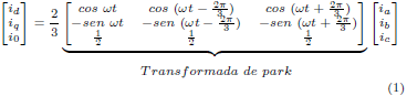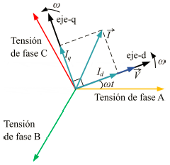 Para la mayoría de las aplicaciones industriales de los CEP, el control de potencia activa y reactiva se lleva a cabo mediante la transformación del vector trifásico de tensión y de corriente en vectores expresados en componentes de un sistema coordenado rotativo, en donde el vector de la variable se descompone en un vector de eje directo y en otro de cuadratura (d − q) [25]. De la teoría de los sistemas eléctricos de potencia, el operador que permite transformar la representación de las variables eléctricas trifásicas abc a un marco referencial de coordenadas d − q es la transformada de Park, tal y como se indica en (1). En esta ecuación, expresada para la corriente, id, iq e i0 son las componentes en eje directo, en cuadratura y homopolar (dq0), respectivamente, de las corrientes trifásicas ia, ib e ic. ω es la pulsación angular de la red, que es la velocidad angular a la que gira el sistema coordenado d − q. En la Figura 4 se muestra un ejemplo de descomposición del vector corriente, I, en las componentes: Id e Iq. Se puede aplicar un razonamiento similar para la tensión.