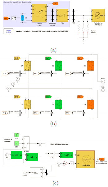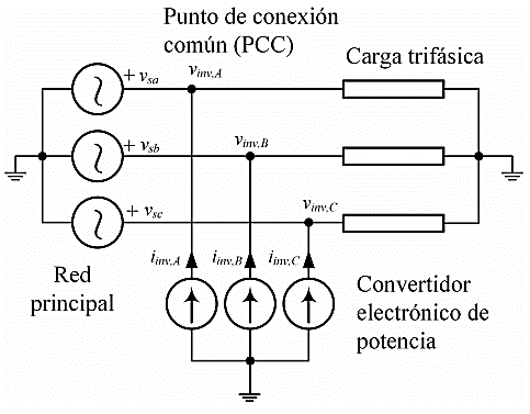 La Figura 9 muestra la representación trifásica del diagrama de la Figura 8b, en la cual el CEP es modelado por medio de una fuente controlada de corriente. Esta fuente deberá inyectar unas corrientes trifásicas iinv,A, iinv,B e iinv,C cuya amplitud y fase serán definidas de acuerdo con el criterio de control implementado y las aplicaciones asignadas al convertidor.
