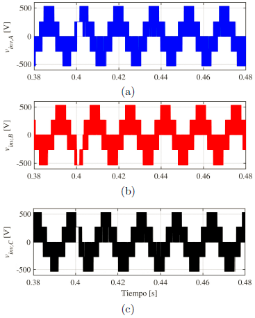 La Figura 6 ilustra la señal de tensión fase-neutro construida por el inversor trifásico mediante la aplicación de la modulación SVPWM y medida en los terminales del inversor (antes de la etapa de filtrado). Como se aprecia en las gráficas, esta tensión de fase oscila a la frecuencia fundamental de la red (60 Hz) y presenta una componente de alta frecuencia (20 kHz) heredada de la portadora empleada para la modulación por ancho de pulso, la cual, será atenuada al pasar por el filtro R-L serie.