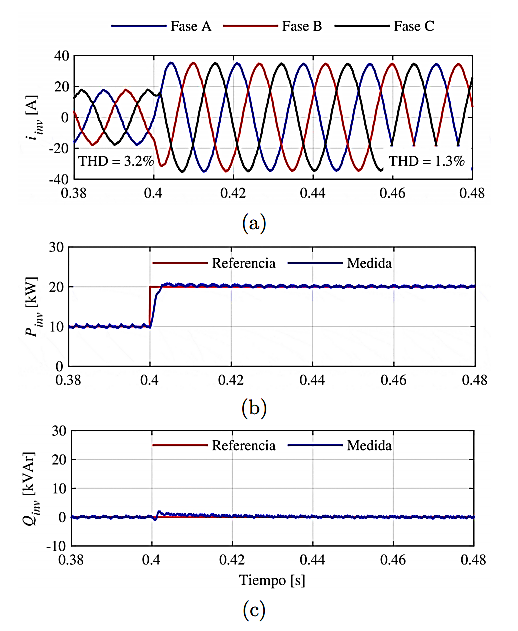 La Figura 7a muestra la forma de onda de la corriente inyectada por el CEP en el PCC, la cual ha sido construida por el controlador PQ del inversor para el cumplimiento de las consignas de potencia activa y reactiva establecidas. La dinámica en el dominio del tiempo muestra el correcto desempeño del inversor y, además, la efectividad en las labores de filtrado (los valores de distorsión armónica total (THD) se aportan en la misma figura). En base a las mediciones de tensión y corriente en los bornes del CEP se han graficado, además, las dinámicas adoptadas por la potencia activa y reactiva inyectadas en el PCC (Figuras 7b y 7c, respectivamente). Nótese en la Figura 7b cómo el CEP sigue correctamente la consigna de potencia activa establecida en el sistema de control PQ.