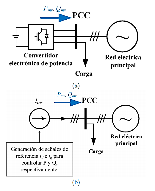 En primer lugar, se pide considerar el diagrama de la Figura 8a. Esta ilustración es una representación sintetizada del sistema eléctrico mostrado en la Figura 2. De acuerdo con el modo de operación del CEP, este inyectará en el PCC unos valores de potencia activa y reactiva, Pinv y Qinv, respectivamente, de acuerdo con sus valores de consigna preestablecidos. Debido a que la tensión trifásica en el PCC está impuesta por la red (en amplitud y frecuencia), el CEP tendrá que inyectar una terna de corrientes tales que permitan alcanzar las potencias de referencia P∗inv y Q∗inv, como se ha visto en los resultados ilustrados en la Figura 7. Por tanto, desde el punto de vista de la red en el PCC, el CEP se comporta como una fuente de corriente trifásica controlada (Figura 7a) cuya amplitud y fase dependerá, como ya se ha mencionado, de los valores de consigna de potencia. De acuerdo con la teoría de las componentes d − q (sección 2.1.2), las corrientes trifásicas inyectadas están relacionadas de forma directa con las variables Pinv y Qinv, dada su dependencia con las componentes de corriente id e iq, respectivamente (Ecuaciones 4 y 5). La Figura 8b ilustra el criterio de simplificación del modelo del CEP, al representarlo como una fuente de corriente controlada, cuyo esquema de control se desarrolla a continuación.
