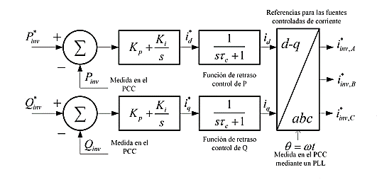 Este último par de expresiones vislumbra las ventajas de emplear las coordenadas d − q para el control de la potencia inyectada por el CEP a la red, pues, la regulación de la potencia activa dependerá únicamente del manejo de la variable id, mientras que, el de la potencia reactiva, estará en función de iq. Esto significa que el control de potencia P pueden llevarse a cabo de forma desacoplada de las consignas aplicadas al control de potencia Q, siendo necesario para este propósito el diseño de un solo controlador por variable. En el recuadro inferior de la Figura 2 se muestra un ejemplo de implementación del controlador PQ para el inversor trifásico en estudio.